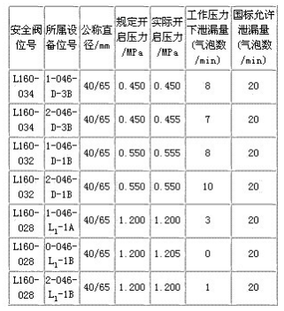 針對受熱變形泄漏問題,經(jīng)反復比較試驗,改進了原安全閥密封結(jié)構(gòu),將閥瓣與導向塊連成一體,將錐面密封改為平面密封,增加了閥瓣厚度,并在閥座和閥瓣的密封面上堆焊鈷基硬質(zhì)合金,以提高密封面的耐溫性能和表面硬度,解決了受熱變形泄漏問題,改進后的閥瓣結(jié)構(gòu)見圖1b。根據(jù)成套設備的安裝尺寸及性能參數(shù),首批試制了2個品種、3個規(guī)格共7臺平面密封安全閥,適用介質(zhì)為聯(lián)苯加聯(lián)苯醚,工作溫度小于或等于330 ℃,開啟壓力分別為0.45MPa、0.55MPa和1.2MPa。安裝于某生產(chǎn)線上連續(xù)試用123天,停產(chǎn)檢修時拆下進行開啟壓力和密封性檢驗,結(jié)果見表1。表中數(shù)據(jù)說明,試用的這批安全閥,開啟壓力和密封性能均達到國家標準規(guī)定的優(yōu)質(zhì)品要求。