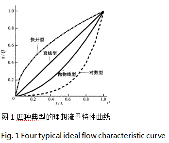 在常見(jiàn)的調(diào)節(jié)閥中,有四種典型的流量特性曲線(xiàn),即直線(xiàn)型、對(duì)數(shù)型(也稱(chēng)等百分比型)、快開(kāi)型、拋物線(xiàn)型」,分別對(duì)應(yīng)圖1中的曲線(xiàn)1、2、3、4。直線(xiàn)型流量特性的調(diào)節(jié)閥,流量隨行程線(xiàn)性變化,在小開(kāi)度時(shí)流量變化明顯(流量變化量與流量的比值大),調(diào)節(jié)靈敏度高,而在大開(kāi)度時(shí),流量變化相對(duì)緩慢(流量變化量與流量的比值小),調(diào)節(jié)靈敏度低,因而出現(xiàn)大開(kāi)度下調(diào)節(jié)能力不足等問(wèn)題,因此在一些情況下不能滿(mǎn)足調(diào)節(jié)要求。對(duì)數(shù)型流量特性的調(diào)節(jié)閥,流量變化速度逐漸加快,小開(kāi)度時(shí)流量變化緩慢,調(diào)節(jié)精度高,大開(kāi)度時(shí)流量變化相對(duì)較快,能保持良好的調(diào)節(jié)能力,這些特點(diǎn)使其在工程中得到了廣泛的應(yīng)用。拋物線(xiàn)型調(diào)節(jié)閥的調(diào)節(jié)特性介于直線(xiàn)型和對(duì)數(shù)型兩者之間田,這種特性的調(diào)節(jié)閥在工程應(yīng)用中也比較常見(jiàn)。快開(kāi)型調(diào)節(jié)閥的調(diào)節(jié)特點(diǎn)與對(duì)數(shù)型相反,小開(kāi)度時(shí)流量迅速變化,達(dá)到快速加大流量的目的,而大開(kāi)度時(shí)流量變化緩慢。除了這四種典型曲線(xiàn)外,還有雙曲線(xiàn)型、平方根型等流量特性曲線(xiàn),但并不常見(jiàn)。