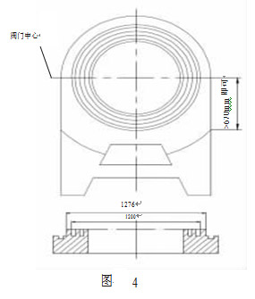 為電動閘閥導軌和閥板的配合示意圖,導軌均為楔形結構,導軌與座圈組裝后,形成一帶角度的空隙,閥板導軌在此空隙間移動。要求閥關閉后其閥板與閥座圈密封面的間隙平均小于 0.051mm。此閥為常開閥,正常情況下,每年關閉不超過 1 次,關閉時,一方面靠流通介質的力量使閥板與座圈貼緊,另一方面,通過閥板楔入,使閥板與座圈的密封面貼緊,從而達到密封的目的。 該閥門的開關行程為 1300mm,理論上座圈導軌的工作長度是 1300mm(從閥門中心起),實際上座圈導軌除閥門通道口受流通介質沖蝕外,其余部分只起導向作用,所以我們可以在滿足工況要求的前提下將座圈導軌的堆焊部位縮短,使其長度大于環形密封面口徑的一半 670mm (從閥門中心起)即可。 考慮以上原因,我們調整加工工藝為:粗車平面及環形堆焊槽,粗車導軌堆焊部位(粗車圖如圖 4),劃導軌堆焊位置線,堆焊,熱,校平,精車環形密封面,精刨導軌,在粗加工階段為盡量增大工件的剛性,同時減少工序周轉,座圈尾部先不加工,精加工完環形密封圈及導軌后,在導軌與環形密封面夾縫處仍有大量毛坯高出密封面及導軌,須將其去除,我 們采用銑加工。