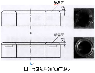 為了避免等離子弧高加熱速度和溫度產(chǎn)生的涂層剝落破壞的開裂、飛濺、滴流及其他不良影響,在任何加工形式時(shí)應(yīng)仔細(xì)選擇噴涂規(guī)范。等離子弧噴焊時(shí)的工藝參數(shù)如表1所示。等離子噴涂噴槍的功率40 kw,送粉方式為槍外送粉。另外,噴嘴到工件距離為1儺巧mm,工作臺(tái)轉(zhuǎn)速10、巧r/min等離子弧噴焊時(shí)和噴焊后的閥座外觀如圖2所示。
