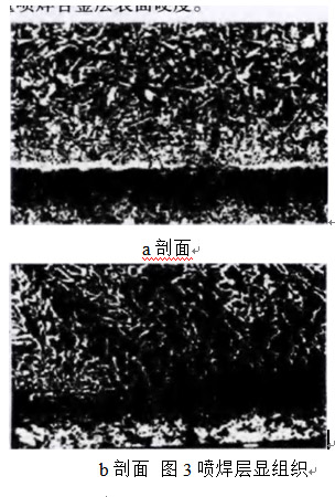用OLYMPUS-PME3金相顯微鏡(0M)和JSM弘5C 掃描電鏡(SEM)對(duì)噴焊合金層進(jìn)行顯微組織觀察和分析,如圖3所示。用HR-150AT型光學(xué)洛氏硬度計(jì)測(cè)量噴焊合金層表面硬度
