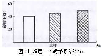 三個(gè)試樣硬度分析結(jié)果如圖4所示。由于鎳基堆焊合金層存在較高的cr,會(huì)形成更多化合物相,且其組織細(xì)小均勻,硬度較高,滿足耐磨性的要求。